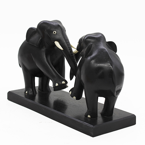 Mahogany Wood Fighting Elephants - Large, with ivory coloured tusks. Hand carved Fighting Elephants with black colour.