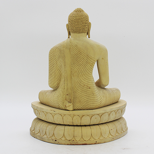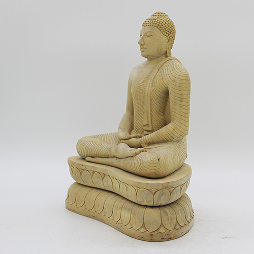 Kolan Wood Buddha Statue - Large. Hand carved Buddha statue in Samadhi pose. In this pose, the Buddha is depicted with both hands in the lap, face up, and the legs are crossed, either in a Double Lotus pose (with the ankles of each leg tucked behind one another in a locked position), or in a Single Lotus pose (where one leg rests on top of the other leg). Occasionally, an alms bowl is placed in the lap as well. As this statue generally represents focused concentration, the eyes of the Buddha are either depicted as halfway closed, or closed nearly all the way. The silhouette of the statue is shaped - more or less - like a triangle, which represents stability.